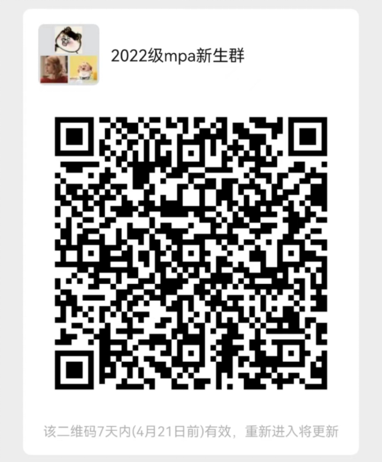 1. 加入2022MPA新生微信群,进群后务必将自己的备注改成真实姓名(身份不实的会定期清理)。群二维码如下(群二维码只有7天有效期,过期后请发邮箱联系学校询问新二维码):