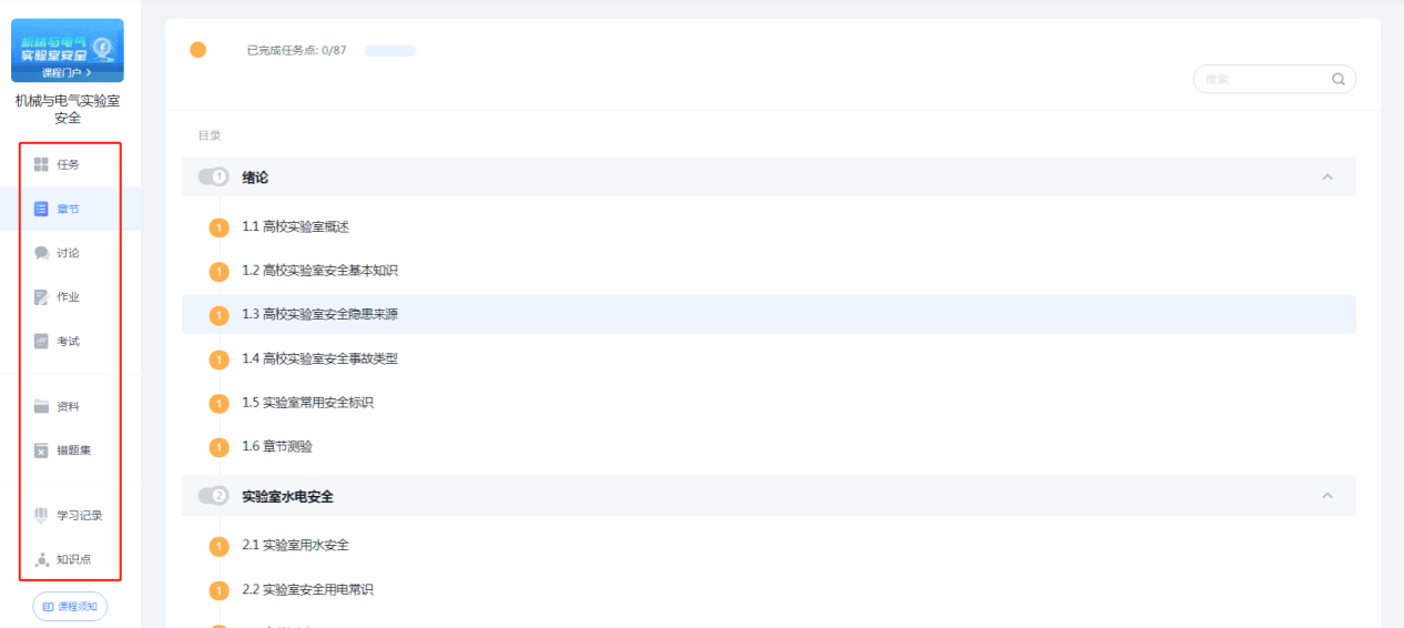 2.进入课程后,左侧为学习导航,可即时收到老师发布的学习任务、考试、查看自己的学习记录。任务点为必须完成的学习内容!
