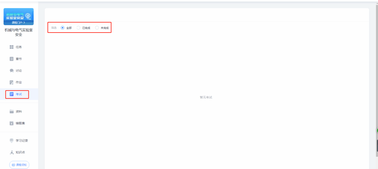 考试:老师发布的考试在考试模块查看,可根据全部,未完成,已完成进行筛选。