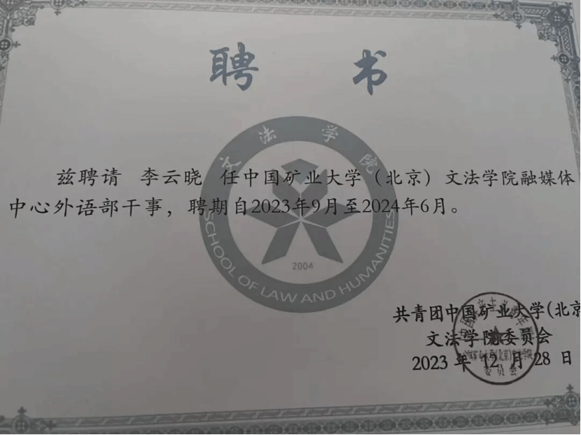 我与矿大初次结缘是在高考前100天的誓师大会,那时一模刚刚结束,老师根据我的成绩进行简短的评估,地矿油三大院校全部在列,在进行详细的了解后,不论是从学校的生活条件,教学条件,北矿都成了我的理想院校。在高考结束后,我顺利被文法学院英语专业录取。那一刻,我与文法学院缘分的种子已经悄然发芽,我相信站在了一个新的起点,准备开始一段全新的旅程。文法学院,这个充满人文气息和学术氛围的地方,成为了我实现梦想的舞台。