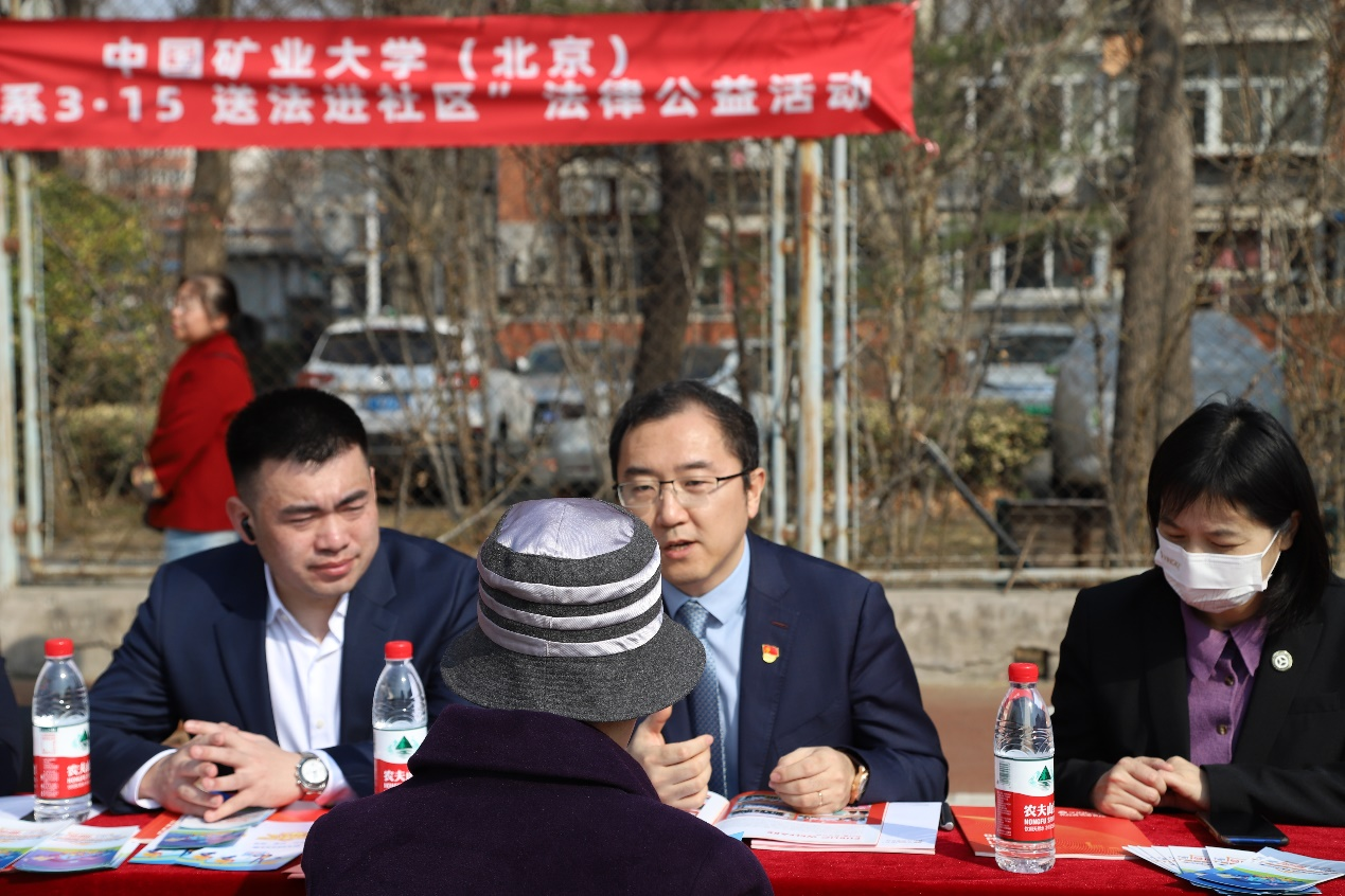 2024年3月15日,在第42个“3·15消费者权益保护日”来临之际,中国矿业大学(北京)联合北京市盈科(海淀区)律师事务所共同走进北京市海淀区学院路街道矿业大学社区,开展“情系3·15,送法进社区”法律公益活动。活动在矿业大学社区引起广泛关注,居住在社区的退休教师、老人、务工人员等,纷纷来到法律咨询台前,向志愿提供法律服务的教授、律师、社区工作者进行专业咨询。