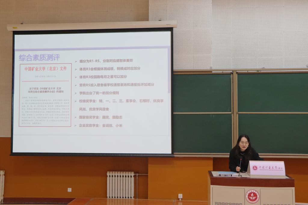 穆子君从德智体美劳五个方面解读了综合素质测评细则,随后介绍了学校保研政策以及文法学院推免细则,展示了近三年的保研去向,鼓励同学们认真规划学习生活。