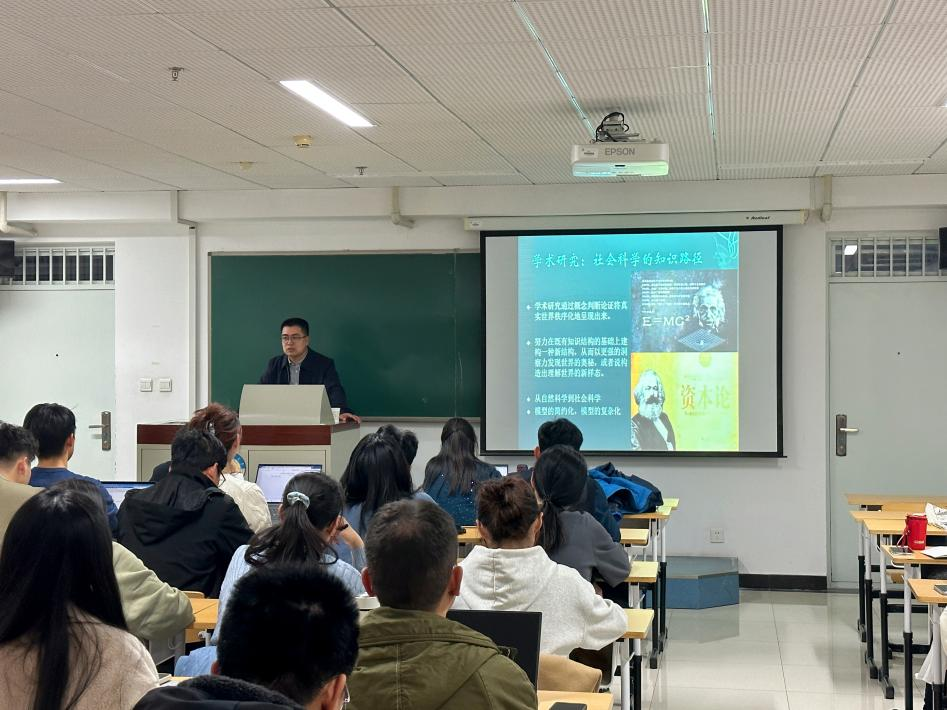 2023年11月22日下午3点,中国矿业大学(北京)文法学院第109期“方法与前沿”双周论坛在学院路校区逸夫楼716室举行。本次论坛邀请中国行政管理学会曹胜研究员作题为“面向理论与实践的学术探索:在个体与共同体之间”的专题报告。文法学院副院长谭爽教授及学院部分师生参加讲座,论坛由南锐教授主持。