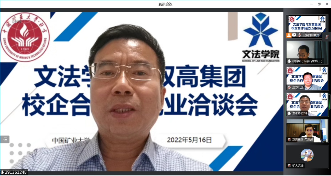 5月16日,文法学院与北京双高国际人力资本集团以线上方式举行校企合作促就业洽谈会。校党委副书记王忠强出席会议并讲话。北京双高集团人才发展事业部负责人、北京双高志远管理咨询有限公司副总经理范高超,北京市昌平区市场监督管理局市场科副科长、文法学院2014届行政管理硕士张园晟,文法学院院长殷召良,院党委书记杨洪兵,各年级辅导员、各年级同学及部分校友参加会议。殷召良主持会议。