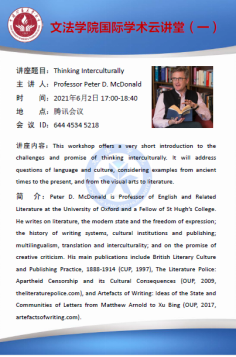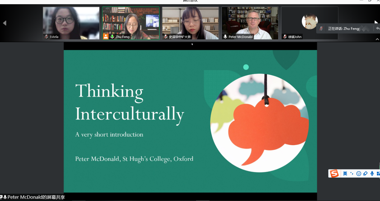 应文法学院外语系朱峰教授邀请,牛津大学Peter D. McDonald教授202162外语系研究生举办了题为Thinking Inter-culturally的讲座。此讲座为英语专业研究生国际前沿课程系列讲座之一,讲座通过腾讯会议平台进行,由朱峰老师主持。英语专业研究生、本科生,非英语专业研究生、本科生,以及外语系部分老师参加了讲座。