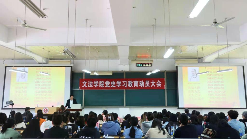 4月2日下午,文法学院党委书记杨洪兵在学院路校区教学楼209为全院师生讲授“学党史开新局”专题党课,沙河校区学生通过腾讯会议平台线上参会。文法学院院长殷召良、副院长许卉艳、副院长刘金程出席此次党课。
