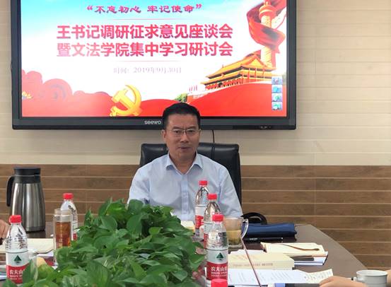 9月30日,文法学院领导班子召开“不忘初心、牢记使命”主题教育集中学习研讨会。校党委副书记王忠强出席会议并督导,院党委书记杨洪兵、院长殷召良、副院长许卉艳、副院长谭爽及各系、办公室有关人员参加,会议由杨洪兵主持。