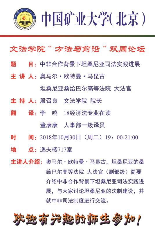 10月30日晚,坦桑尼亚桑给巴尔高等法院(HIGH COURT OF ZANZIBAR)首席大法官奥马尔·欧特曼·马昆古(HON.OMAR O.MAKUNGU)在我校逸夫楼717举办“中非合作背景下坦桑尼亚司法实践进展”报告会,文法学院院长殷召良主持,18经济法学硕士研究生李鸣及人事部一级翻译董康康先生担任同声传译,教师代表张弛博士、朱梦妮博士及法学专业同学100余人参加了报告会。