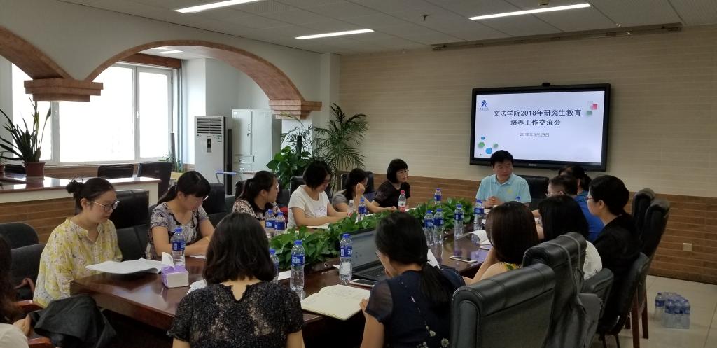 2018年6月29日,文法学院召开了研究生教育培养工作交流会。会议由负责研究生工作的许卉艳副院长主持,殷召良院长、董会泽书记出席,全体研究生导师参加。