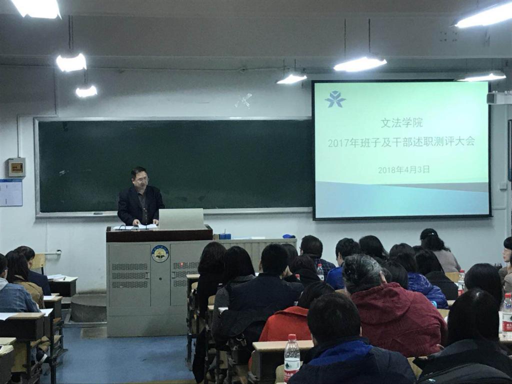 4月3日下午,文法学院2017年度学院班子及干部述职测评大会在理化楼205顺利召开。校党委组织部副部长高来举出席会议。文法学院领导班子成员、全体教师干部以及部分学生代表参加会议。会议由院党委书记董会泽主持。