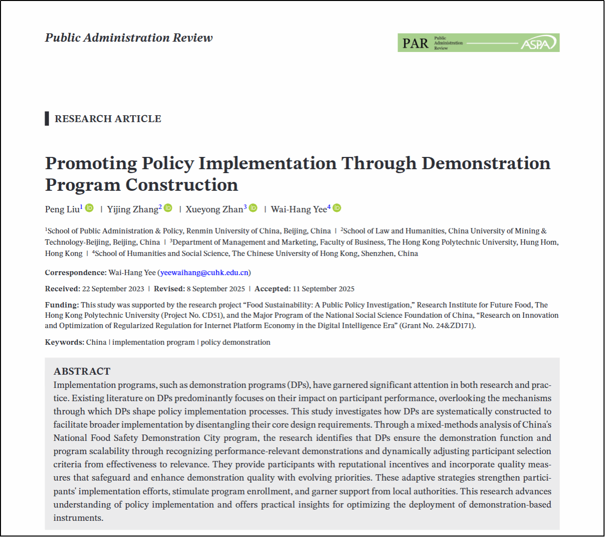Promoting Policy Implementation Through Demonstration Program Construction一文致力于剖析示范项目的核心设计要素,探究其如何通过系统性构建来推动实现广泛的政策执行。对中国“国家食品安全示范城市”项目的混合研究显示,示范项目通过认可示范绩效,并将参与者选拔标准从注重有效性动态调整为注重相关性,来确保示范功能的发挥以及项目的可扩展性。此外,示范项目会为参与者提供声誉激励,并引入质量保障手段,依据不断变化的优先事项来维持和提升示范的质量。这些适应性策略强化了参与者的执行力度,激发了各城市参与项目的积极性,同时赢得了地方政府领导的支持。研究深化了学界对政策执行的理解,并为优化基于示范的政策工具的运用提供了切实可行的思路。(文章全文链接:http://doi.org/10.1111/puar.70039)