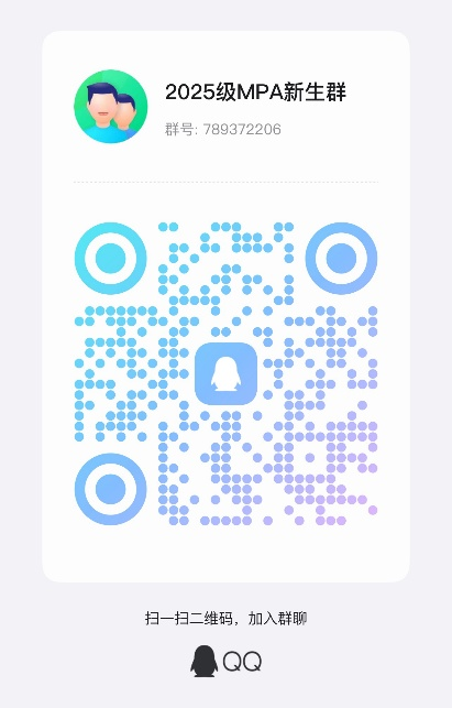 1、加入2025级MPA新生群,扫描二维码或搜索QQ群号:789372206入群,进群需进行身份验证,请务必发送真实姓名进行申请(身份不实的不予通过)。群二维码如下: