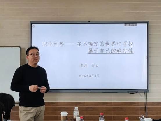 2025年3月4日,我院在学院路校区逸夫楼1214室举办“筑梦启航系列活动”第一期,邀请北京云青智询科技有限公司CEO、教育部万名创新创业导师库首批入库导师白云老师作《职业世界——在不确定世界中寻找属于自己的确定性》主题讲座。