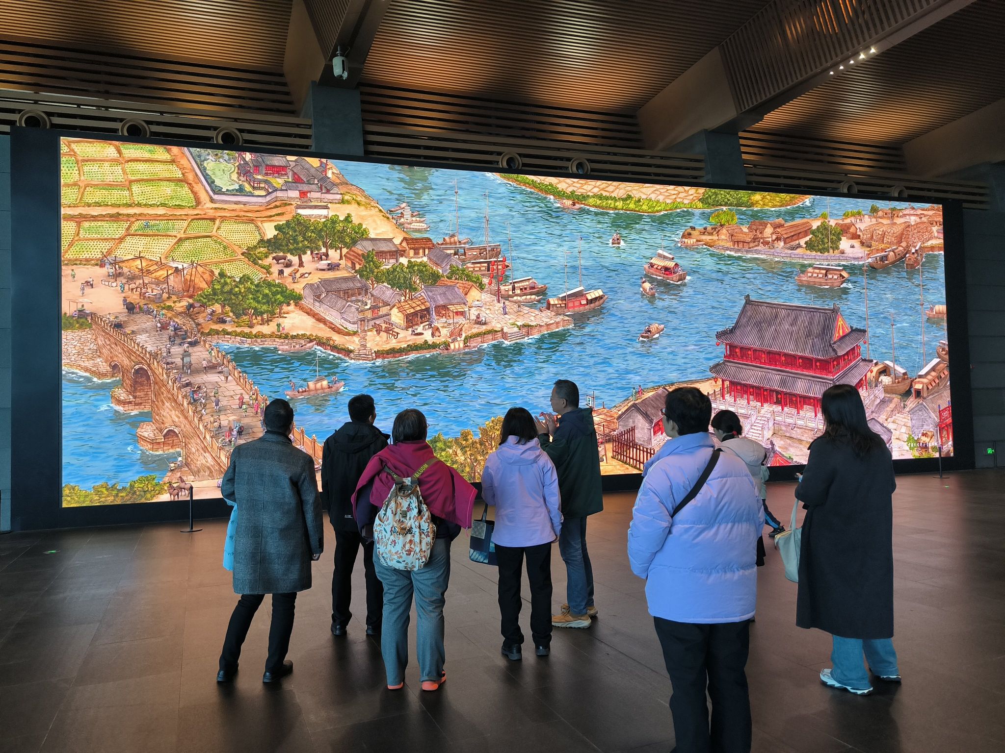 随后,文法学院师生走进大运河博物馆。通过细致地讲解和观看丰富的文物展品、生动的场景复原与多媒体演示,师生了解了大运河跨越千年的发展脉络与辉煌成就,深入感悟运河文化。
