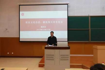 院党委书记杨洪兵以《坚定文化自信,做优秀大学生党员》为主题,与同学们展开了深入的交流。他向同学们介绍了中华优秀传统文化,通过对比中西文化差异,引导同学们正确认识、正确看待文化,树立文化自信;结合世界史和中国革命历程详细论述了马克思主义为中国开辟新道路,如何发展中国特色社会主义文化。同时,引导同学们辩证思考,应对文化风险,维护文化安全,警惕不良文化侵蚀。他希望同学们牢固树立“四个自信”,明辨是非,严格自律,早日成为一名优秀大学生党员。