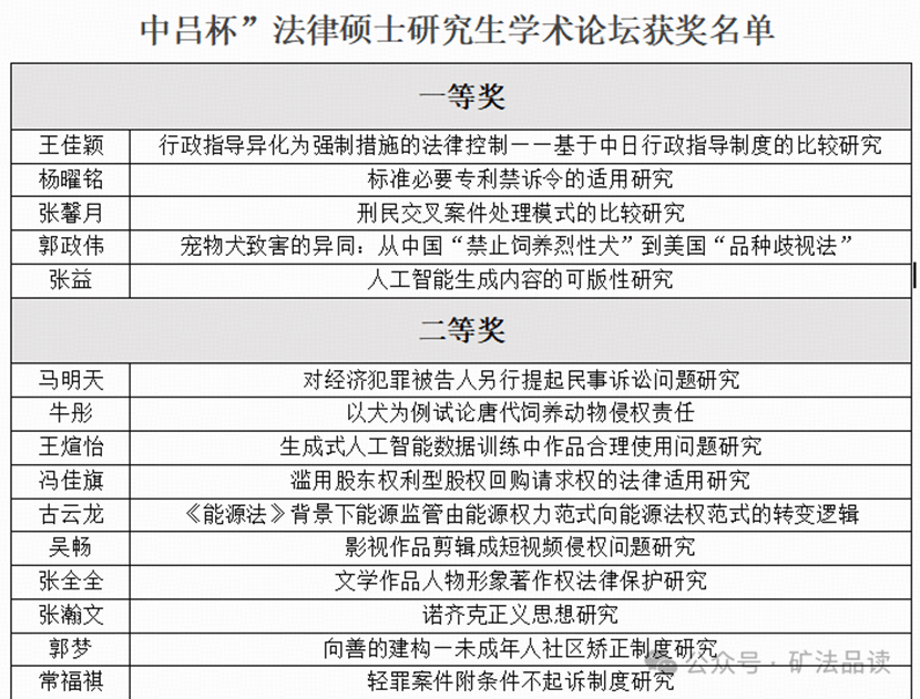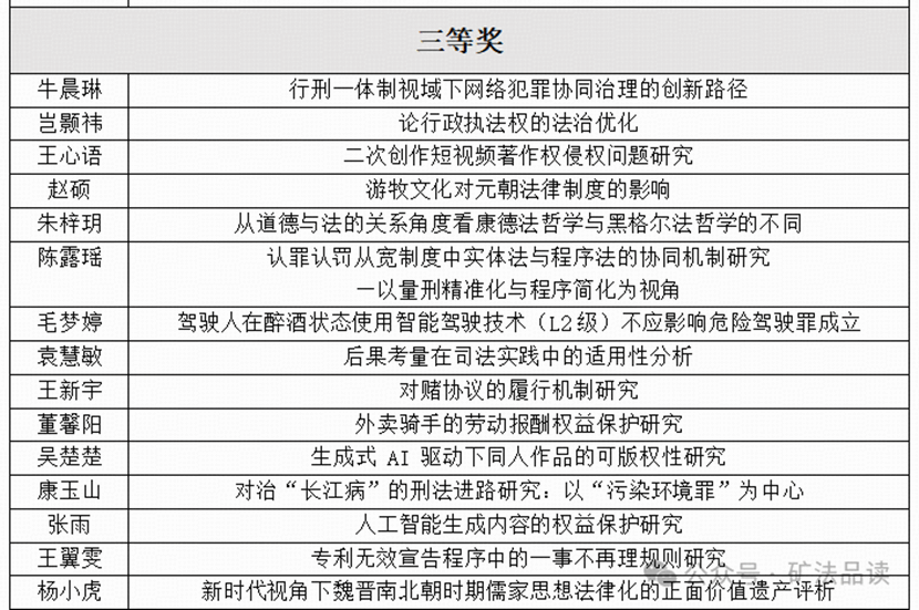 本次论坛面向全体法律硕士研究生征集论文,经过前期初审,共遴选出15篇论文进入二轮答辩环节。答辩过程中,参会学生围绕论文选题背景、研究思路、创新点与实践意义进行系统阐述,并就评审专家提出的问题进行了认真回应,充分展现了良好的理论素养和科研能力。评审老师从选题价值、研究方法、论证质量和写作规范等方面对论文进行了全面评议,最终评选出一等奖论文5篇、二等奖论文10篇,三等奖15篇。现将获奖名单公布如下: