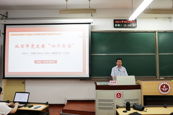 6月9日下午,校党委副书记王忠强在学院路校区教学楼112讲授题为《从百年党史看“四个自信”》的专题党课。文法学院党委书记杨洪兵主持,文法学院师生党员和发展对象100余人聆听党课。 王忠强从道路自信、理论自信、制度自信、文化自...